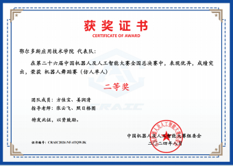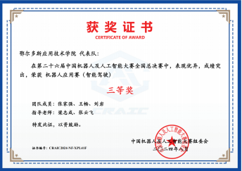 在日前结束的第二十六届中国机器人及人工智能大赛全国总决赛中,由数学与计算机工程系教师张云飞、照日格图、梁志成指导的3支队伍获得机器人舞蹈赛(仿人单人)全国二等奖1项,机器人应用赛(智能驾驶)全国三等奖2项,参赛队员均来自我系21级、22级本科员工。
