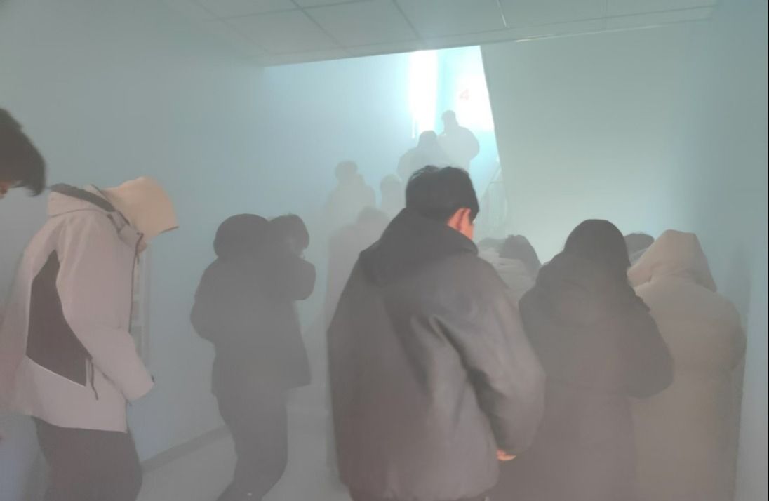 第二环节应急逃生疏散演练。在应急逃生疏散演练环节,设置了烟雾弹模拟实验室突发火灾事件的场景,增强火灾场景真实性,深度提升员工参与感。通过在楼内仿真火灾点位点烟,员工启动疏散流程,并第一时间开启消防广播。楼内各疏散口、楼梯口等重点区域的老师迅速就位,引导员工使用湿毛巾捂住口鼻,沿疏散标识所示方向有序完成疏散。经演练,员工基本可以在规定的时间内完成疏散,未出现员工困在出口处或人员聚集踩踏等情况。