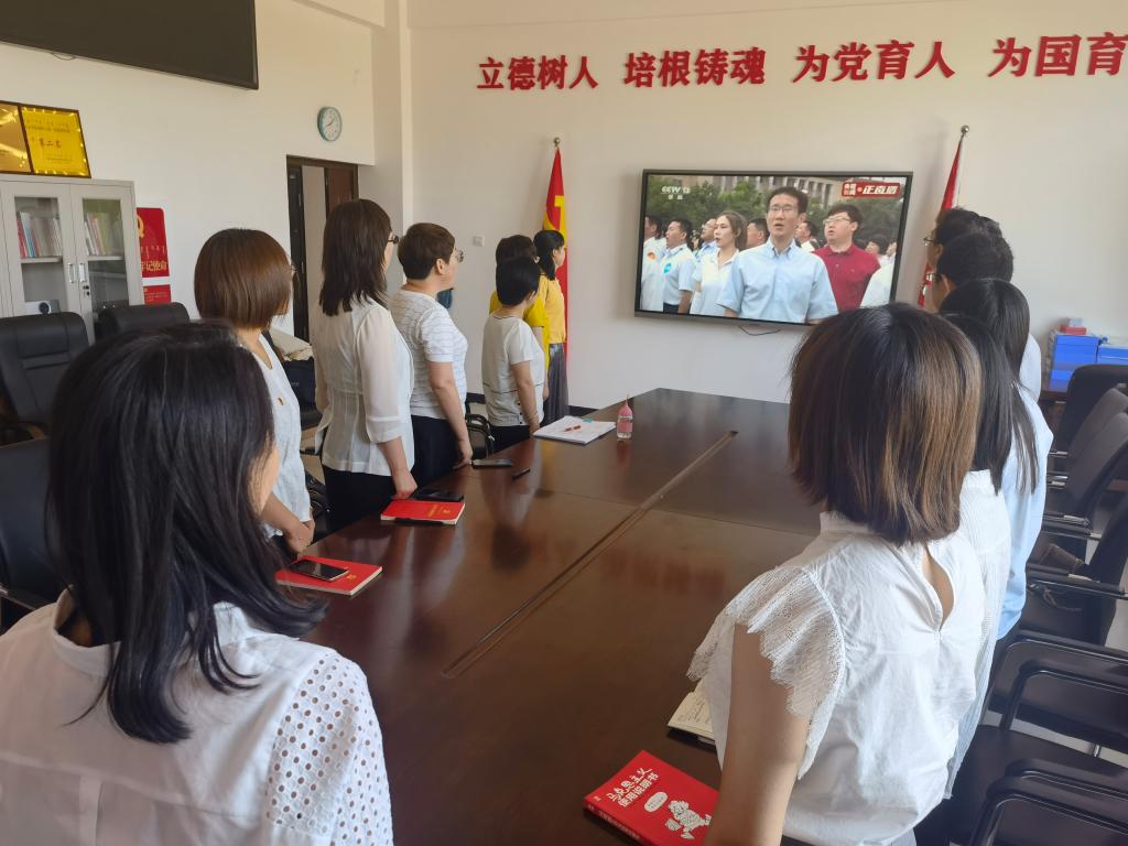 全体教师身穿白衬衣,佩戴鲜艳的党徽,集中在会议室收看庆祝大会现场直播,聆听习近平总书记重要讲话。百年征程波澜壮阔,百年初心历久弥坚。习近平总书记的讲话深深地打动着在座的每一位党员和教师。