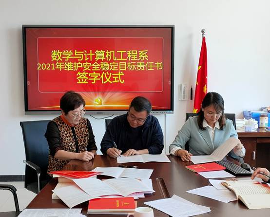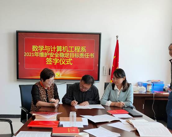 会上,党总支书记孙玉琴和系副主任金涛与各科室负责人签订了《数学与计算机工程系2021年维护安全稳定工目标责任书》。孙玉琴对切实做好今年的安全稳定工作作了部署。她要求各科室负责人要高度重视安全维稳工作;要加强组织建设,认真落实安全稳定工作责任制;经常开展安全隐患排查工作,及时排除隐患;加强安全教育和防盗工作,切实执行我系各项安全管理制度。