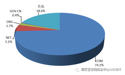 我国境内遭篡改的网站有约7.4万个,其中被篡改的政府网站有318个。从境内被篡改网页的顶级域名分布来看,占比分列前三位的仍然是“.com”“.net”和“.org”,分别占总数的74.1%、5.1%和1.7%,如图所示。