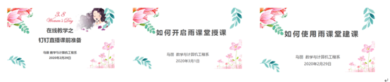 2020年2月29日,马丽老师通过雨课堂创建了“线上教学交流班”。之后的几周时间,马丽老师将自己制作的关于“钉钉直播课前准备”“如何使用雨课堂授课”“如何开启雨课堂授课”“疫情期间线上教学的实践与思考”的课件上传到雨课堂班级里,共教师们参考学习。