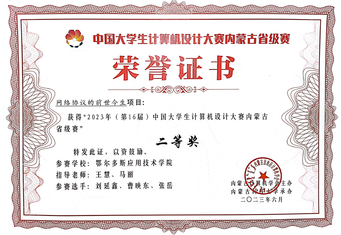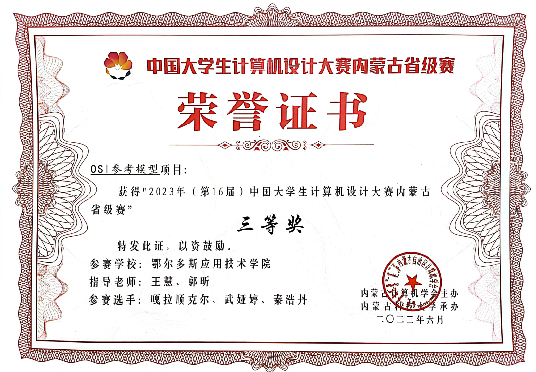近日,由内蒙古计算机学会主办,内蒙古科技大学承办的“2023年(第16届)中国老员工计算机设计大赛内蒙古省级赛”落下帷幕。数学与计算机工程系共派出5个员工团队参加比赛,其中由王慧和马丽老师指导,刘延鑫、曹映东和张岳同学设计的“网络协议的前世今生”项目获得大赛二等奖;由王慧和郭昕老师指导,嘎拉顺克尔、武娅婷和秦浩丹同学设计的“OSI参考模型”项目获得大赛三等奖。