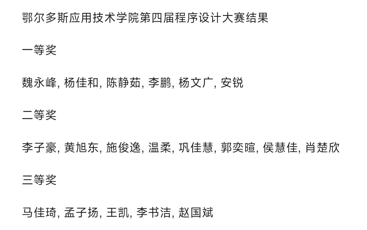 本次比赛线下赛的成绩占总成绩的50%,前4次线上赛成绩占50%。考察范围涵盖基本的循环、判断结构,数组,字符串的操作、素数判断、Ologn复杂度的排序算法。依据竞赛成绩,评选出各级奖励19人次。