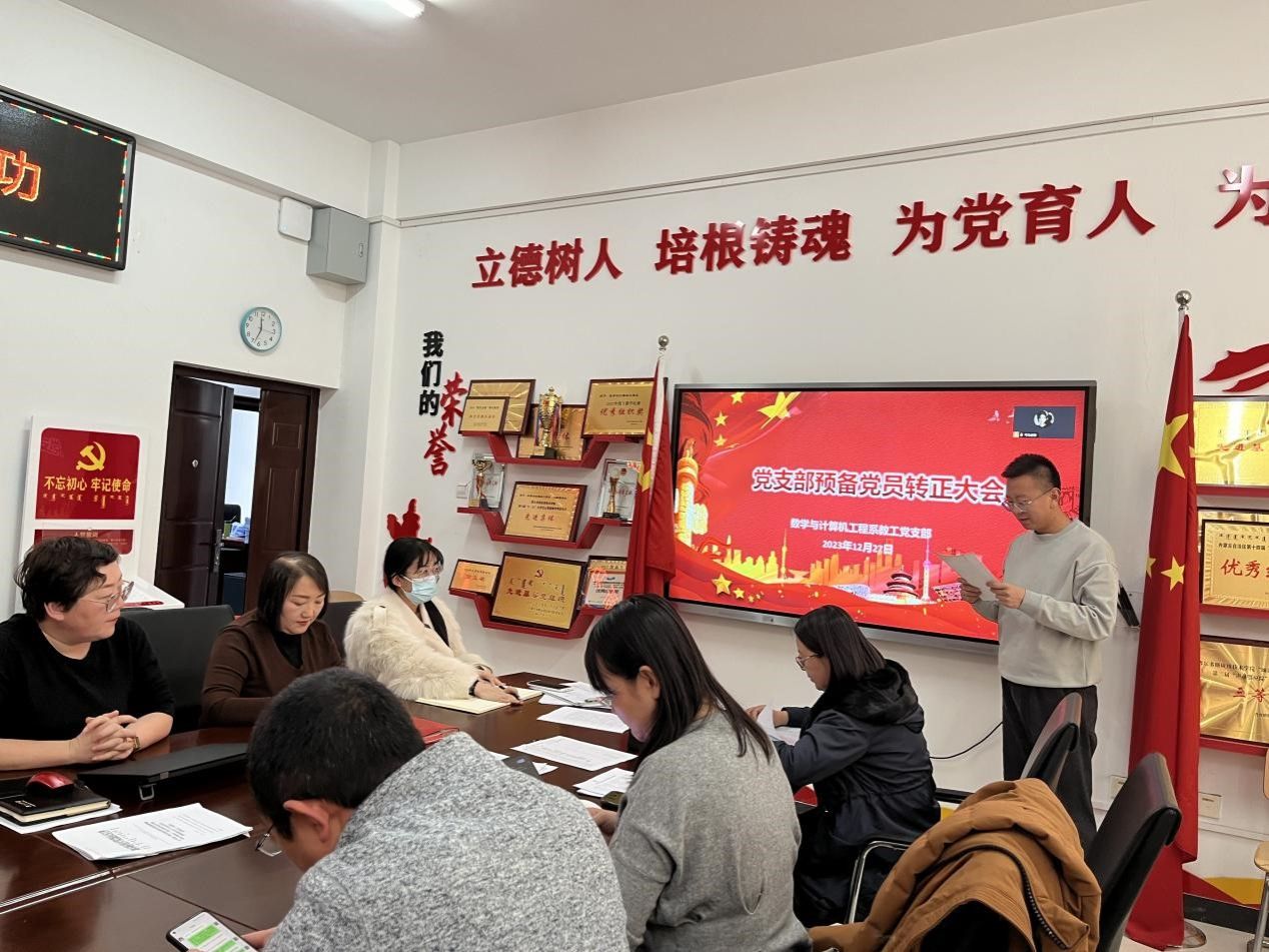 12月27日下午,数学与计算机工程系教师党支部在知行楼105召开党员大会,根据党支部发展党员工作计划,经征求党员和群众意见、支部委员会审查同意,讨论预备党员杭晓良同志的转正事宜。