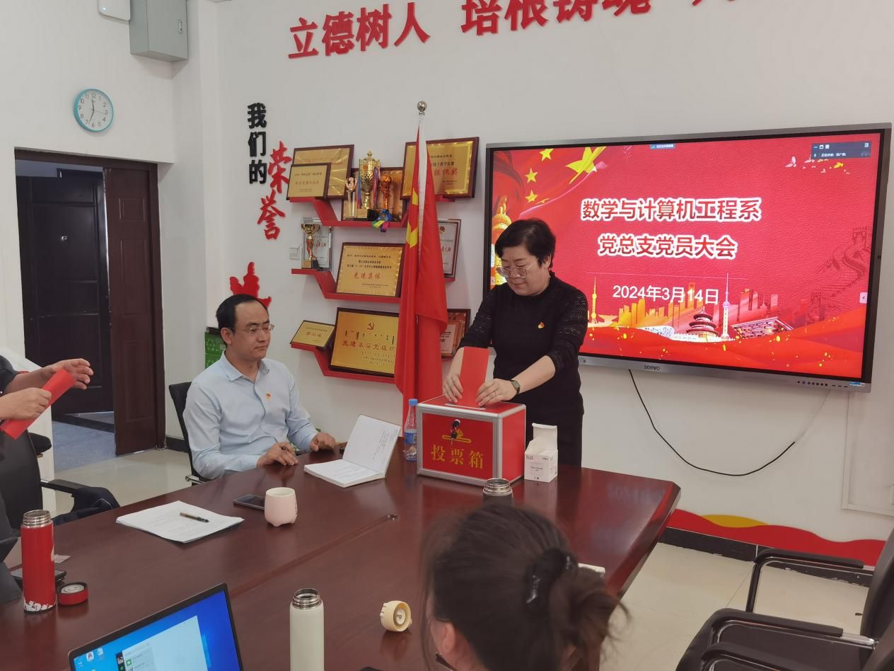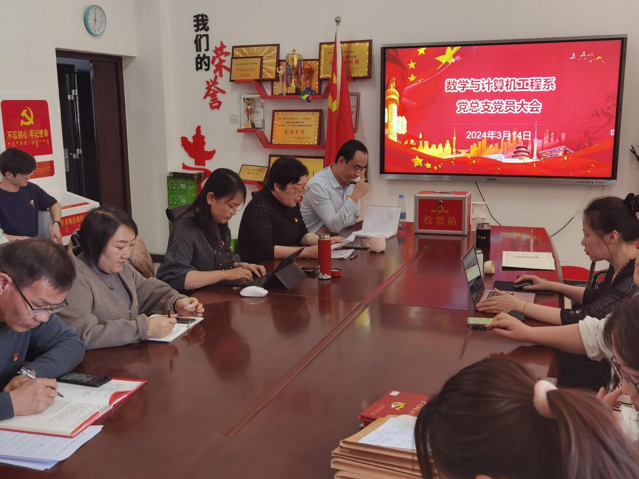 为进一步优化数学与计算机工程系党总支组织结构,加强基层党组织建设,更好的发挥党总支委员会工作职能,2024年3月14日,数学与计算机工程系召开党总支全体党员大会,会议由党总支书记孙玉琴主持,我系全体教工党员和员工党员参会。