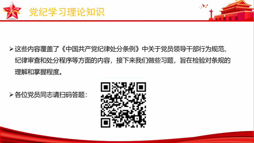 然后进行对《中国共产党纪律处分条例》的重点学习,在理论学习之后进行了党纪学习教育理论知识的扫码答题活动,通过竞答活动,可以有效地检验党员对党纪学习教育理论知识的掌握程度,促使党员进一步巩固和深化学习成果。
