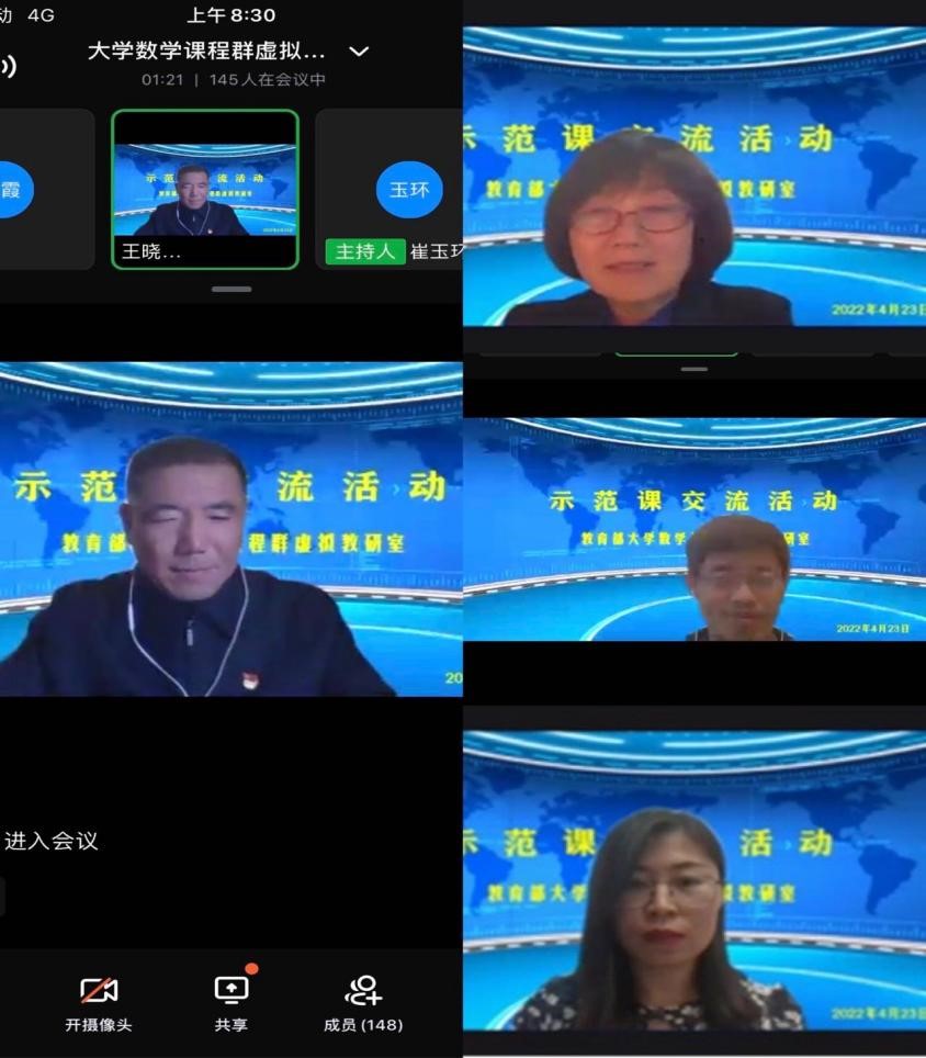 为有效促进教研室成员教学水平的提升,数学与计算机工程系数学和大数据教研室近日参加了教育部“大学数学课程群虚拟教研室”面向全体成员开展的示范课讲授教研活动,分别由华北理工大学理公司刘春凤教授主讲《数值计算方法》课程绪论;西北工业大学数学与统计公司肖华勇教授主讲《数学建模》课程中“TSP 问题的 LINGO求解及应用”;汕头大学数学系单丽副教授主讲:新工科背景下《线性代数》案例式教学创新与实践;河北地质大学数理教学部张玉平副教授《高等数学 》课程中的“梯度” 。