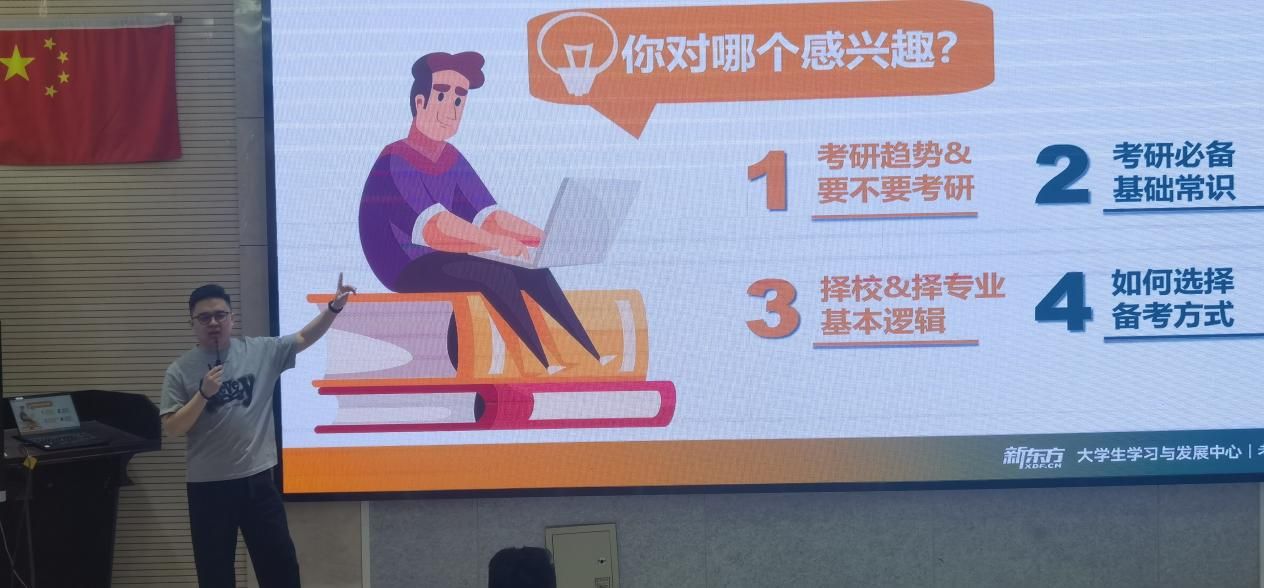 朱老师围绕考研重要性、考研相关常识、院校选择及规划、考研专业选择等核心内容,结合自身专业知识与大量实际案例,为同学们进行了深入浅出的讲解。针对员工在备考中普遍存在的院校专业选择迷茫、复习规划无序、信息资源匮乏等问题,朱老师给出了切实可行的解决办法,引导同学们科学备考。现场互动环节,同学们积极提问,朱老师耐心解答,气氛热烈。