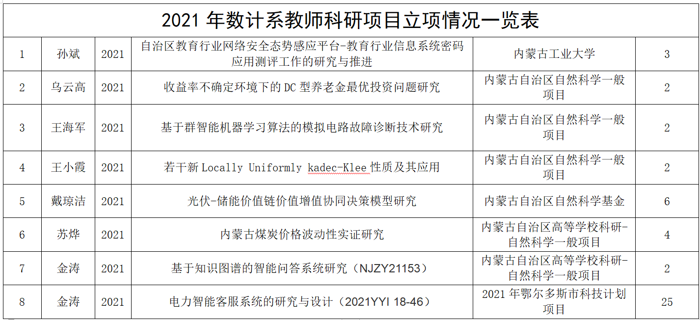 2021年数学与计算机工程系教师立项各级各类科研项目 8 项,到账经费46万元。