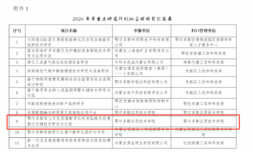 近日,鄂尔多斯市科学技术局公布了2024年度科技计划项目立项名单,我系教师乌云高负责的项目“鄂尔多斯本土文化资源数字化传承弘扬及创意展示关键技术研究与示范”成功入选市重点研发计划立项项目,这是我系在科研领域取得的又一重要成果。
