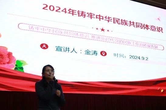 金涛老师以“铸牢中华民族共同体意识,推进新时代党的民族工作高质量发展”为主题,深情而有力地展开了进一步的阐述,她的话语中充满了对中华民族伟大复兴事业的坚定信念和对民族工作深刻洞察的智慧。