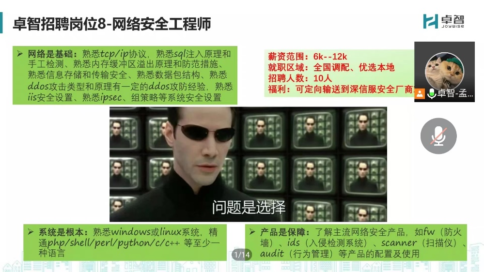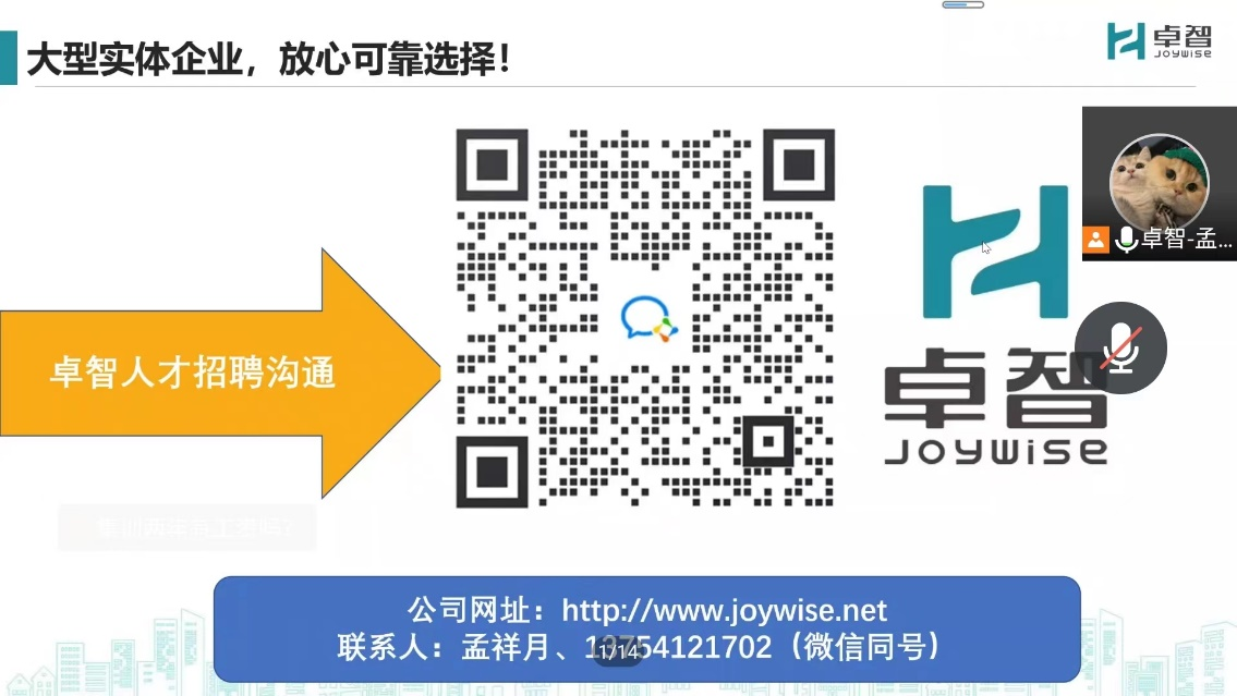 为扎实做好我系2023届毕业生就业工作,提高员工就业质量,2022年11月30日中午12:30,应我系邀请,卓智网络科技有限公司为我系员工召开线上宣讲招聘会。