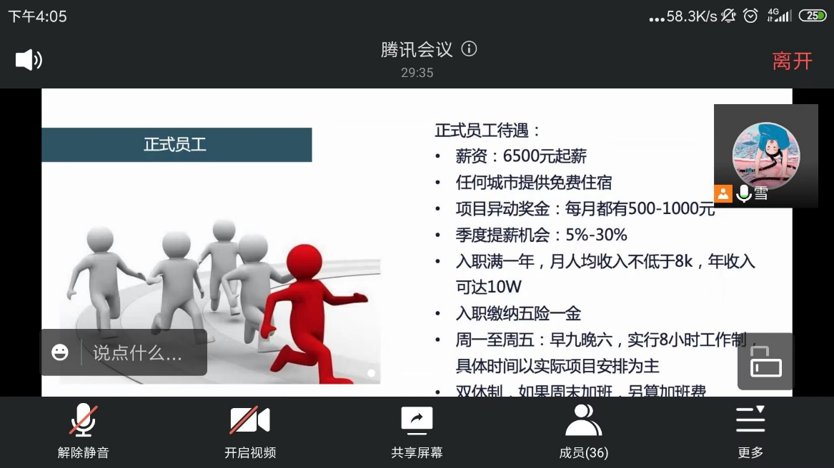 宣讲招聘会以腾讯会议的形式召开,招聘会上企业人力资源部经理分别就:关于我们、公司构成、公司发展历程、未来发展前景、岗位需求、薪酬福利待遇、晋升发展等内容为同学们进行了详细介绍,之后我系员工针对自己有意向的岗位向人力资源部经理详细询问了解,并在线上及时投递了简历。会后通过系部跟进了解到,本次招聘会我系有2名毕业生与该企业初步达成就业意向。本次线上专场招聘宣讲会取得圆满成功。